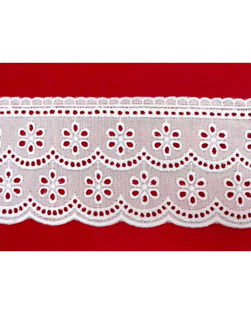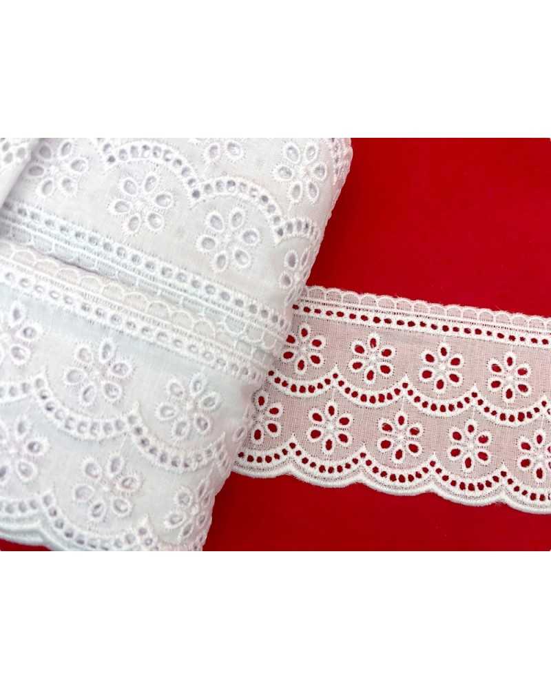 10 metri Pizzo sangallo art. 4BF06G altezza 7,5cm Passamaneria San gallo Bianco Ricamo Fiore Smerlato balza unica