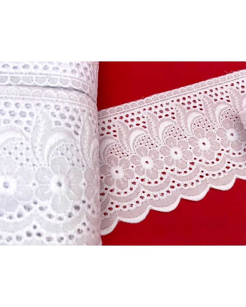 10 metri Pizzo sangallo art. 4BF06G altezza 7,5cm Passamaneria San gallo Bianco Ricamo Fiore Smerlato balza unica