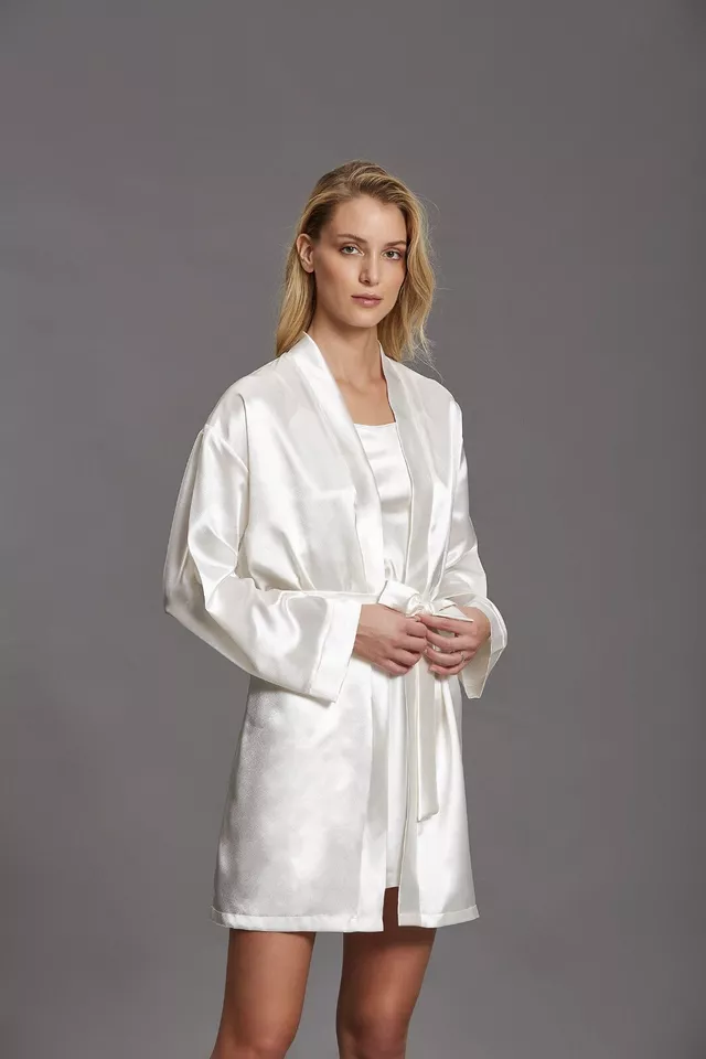 Vestaglia Kimono da donna, intimo lingerie raso manica lunga, in poliestere, linea Lingerie, lungo 88 cm. Coordinabile con: la sottoveste Andra art. 862. Colori disponibili: nero e seta. Taglie disponibili: 2, 3, 4 e 5. Composizione del prodotto: 100% poliestere. Marca: ” Andra “. Codice: ” 862 “.