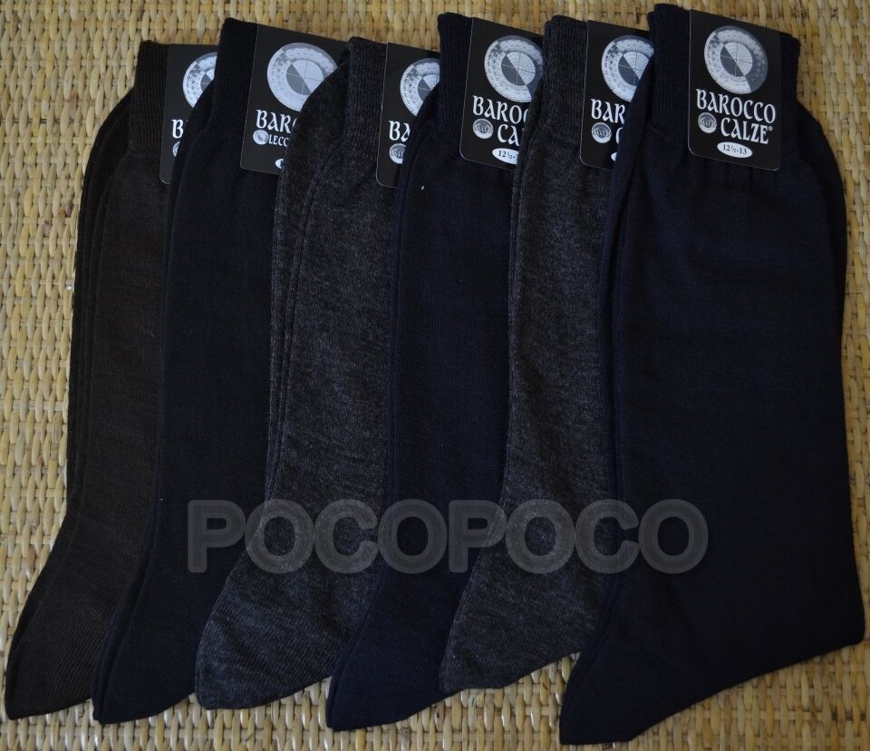 6 Paia di calzini rasati corti, da uomo, calzettini in lana. Colori disponibili: francesi(nero, blu, grigio), blu e nero. Taglie disponibili: 39-41 (10½-11), 42-44 (11½ -12) e 45-47 (12½-13). Composizione del prodotto: 80% lana pettinata e 20% altre fibre. Marca: “ Barocco Leccese ”.