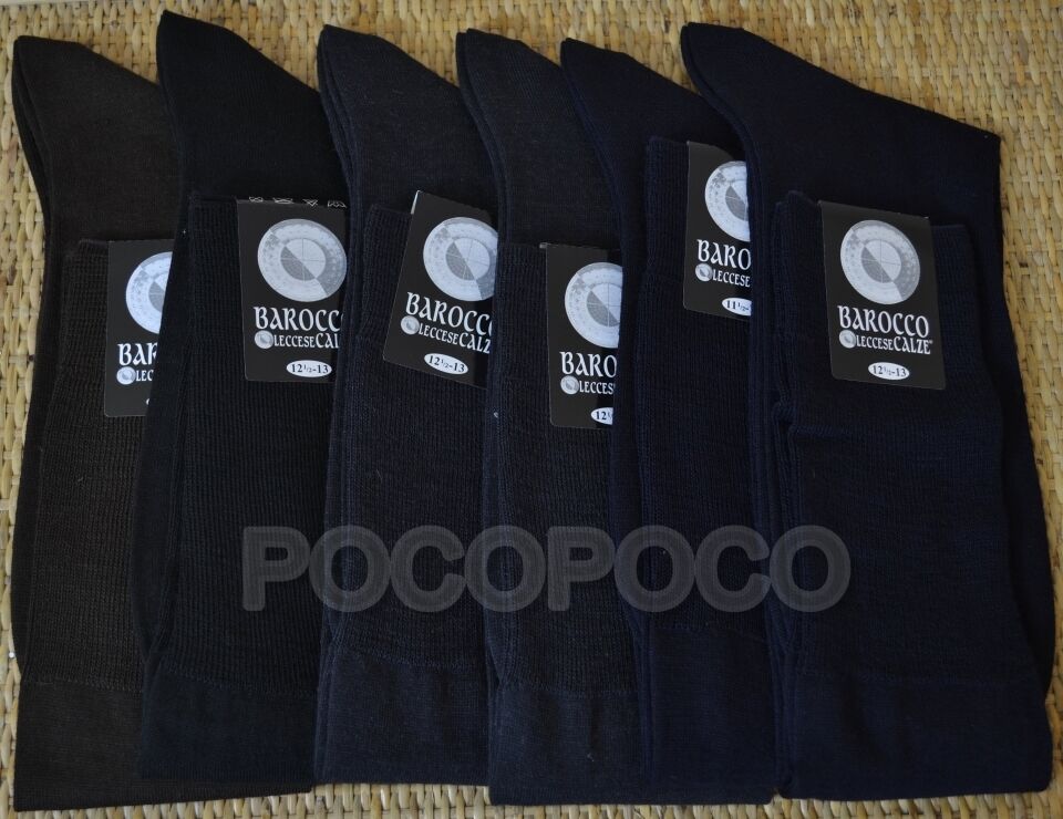 6 Paia di calzini rasati lunghi, calzettini da uomo, calze in lana. Colori disponibili: francesi(nero, grigio, blu), blu e nero. Taglie disponibili: 39-41 (10½-11), 42-44 (11½ -12) e 45-47 (12½-13). Composizione del prodotto: 80% lana pettinata e 20% altre fibre. Marca: “ Barocco Leccese ”.