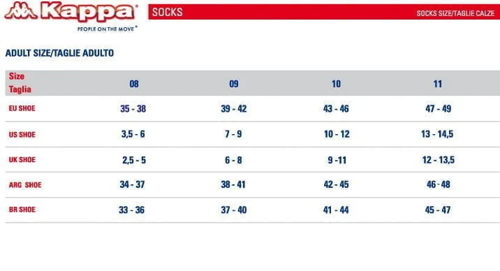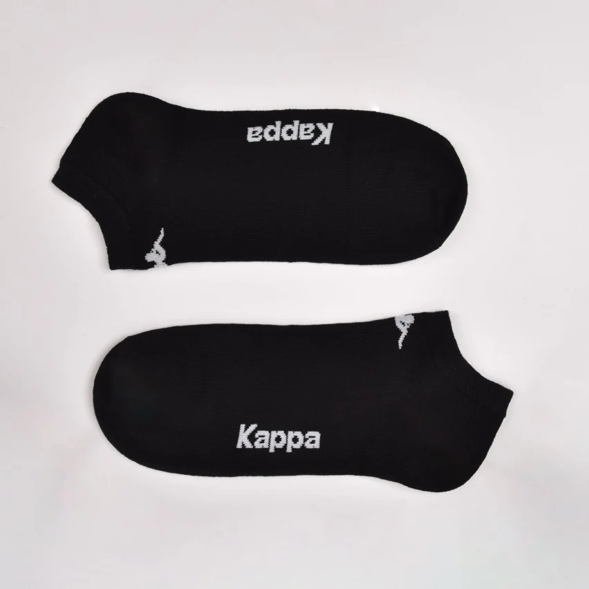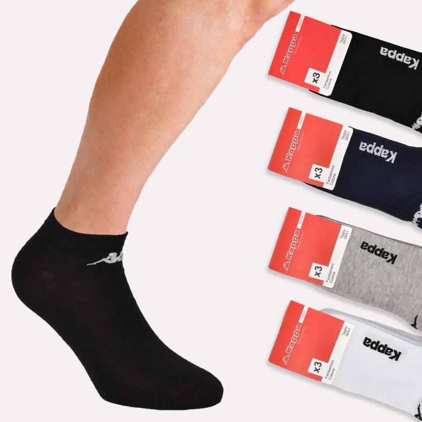 6 Paia di fantasmini unisex, in cotone elasticizzato. Colori disponibili: bianco, nero, grigio e blu. Taglie disponibili: 36-38, 39-41, 42-44 e 45-47. Composizione del prodotto: 77%cotone, 10%poliestere, 10%poliammide e 3%elastan. Marca: “Kappa”. Codice: K006.