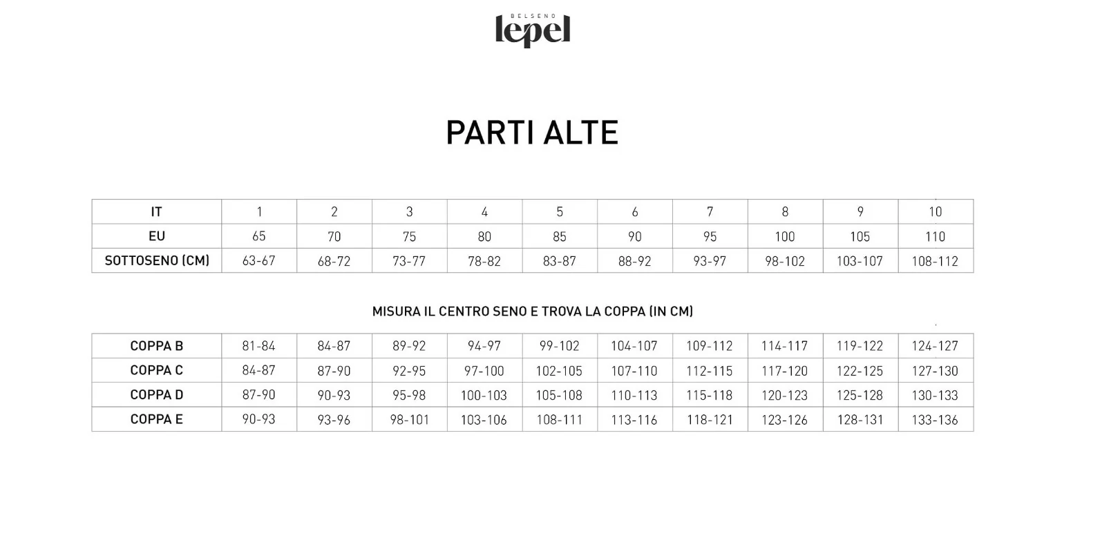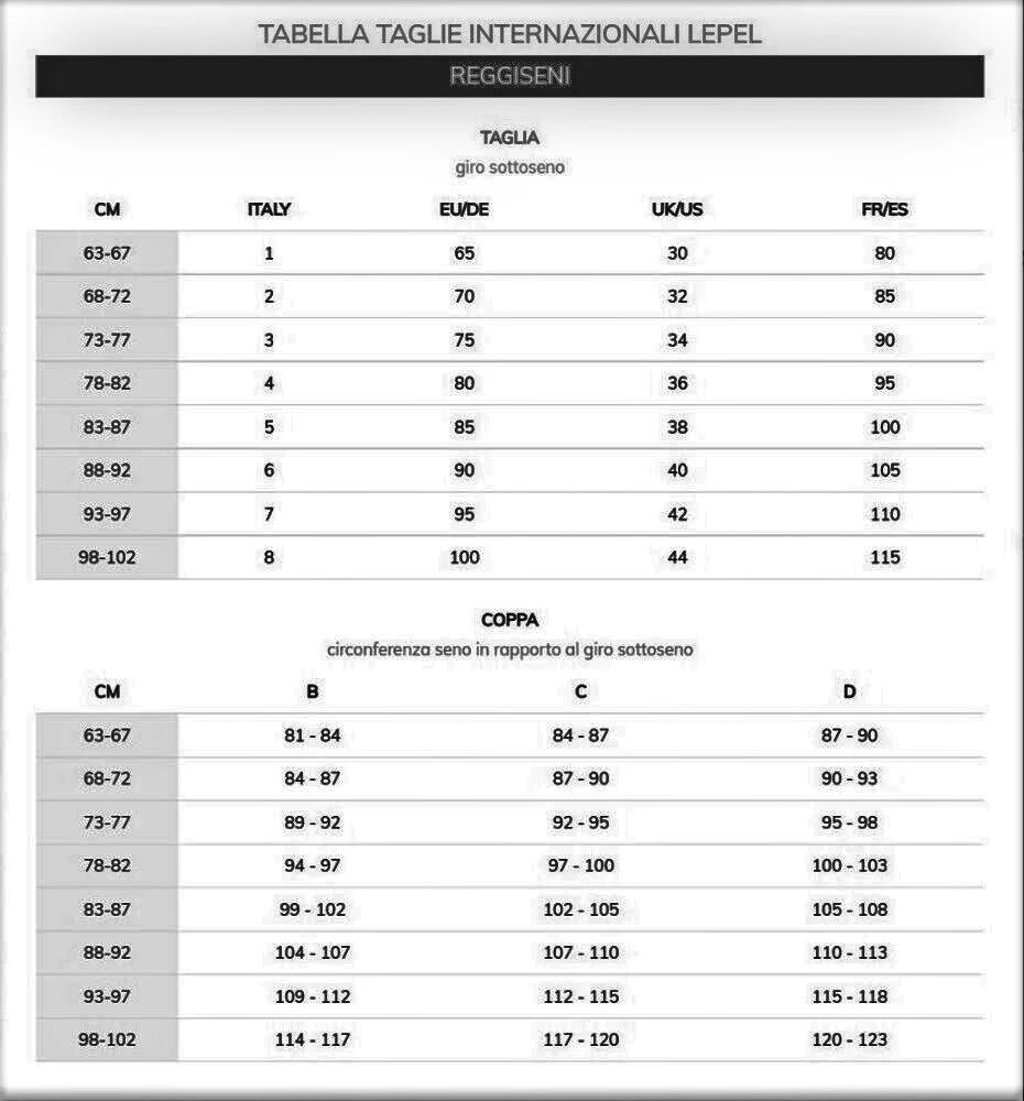 Taglie disponibili: 3, 4, 5, 6 e 7 (coppa B e C); 3, 4, 5 e 6 (coppa D).