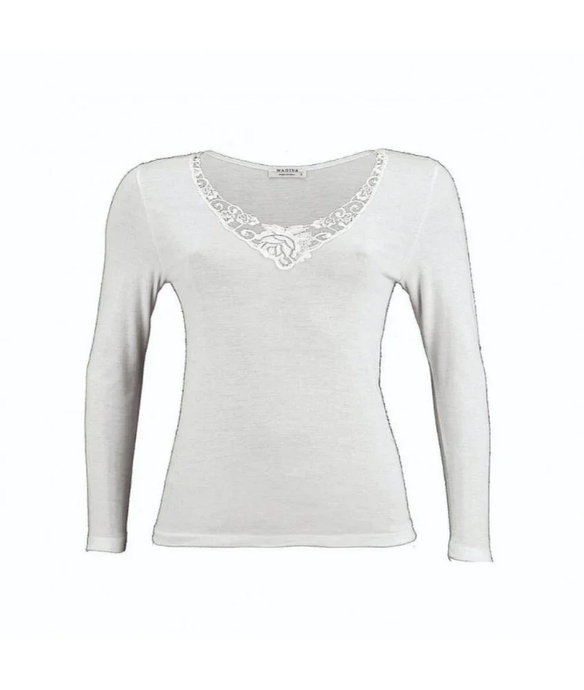 Madiva – canottiera manica lunga scollo V lana Agnese maglietta canotta intima con Inserti in pizzo maglia italiana