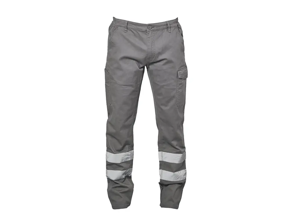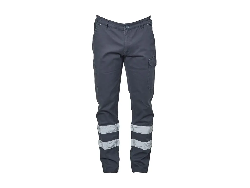 Il pantalone da lavoro in cotone elasticizzato con doppia banda rifrangente (h 5 cm) è progettato per garantire funzionalità operativa e maggiore visibilità in ambienti interni o a traffico controllato.