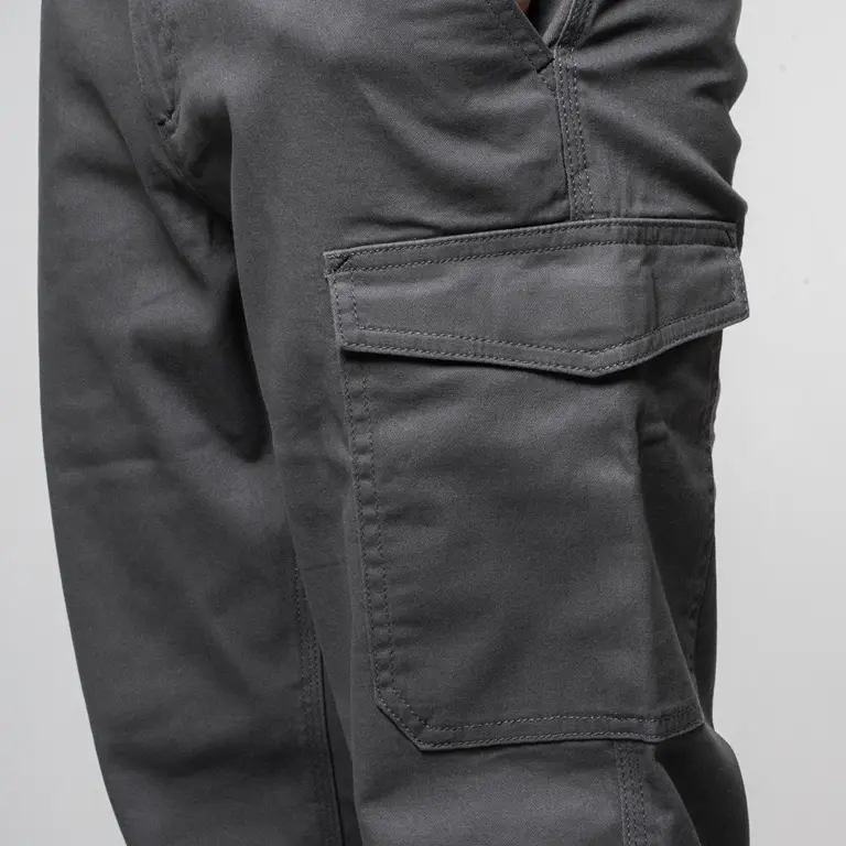 Triple cuciture, impunture di rinforzo a contrasto ed elastici in vita migliorano durata e vestibilità. Passanti maggiorati per cinture da lavoro strutturate.