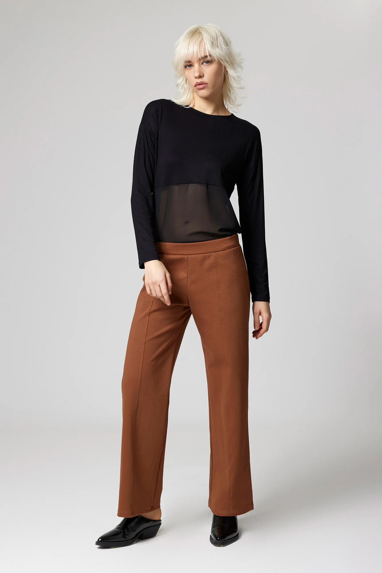 Pantalone realizzato in Punto Roma, un tessuto compatto, confortevole e dalla vestibilità impeccabile, ideale per valorizzare la silhouette senza rinunciare al comfort.