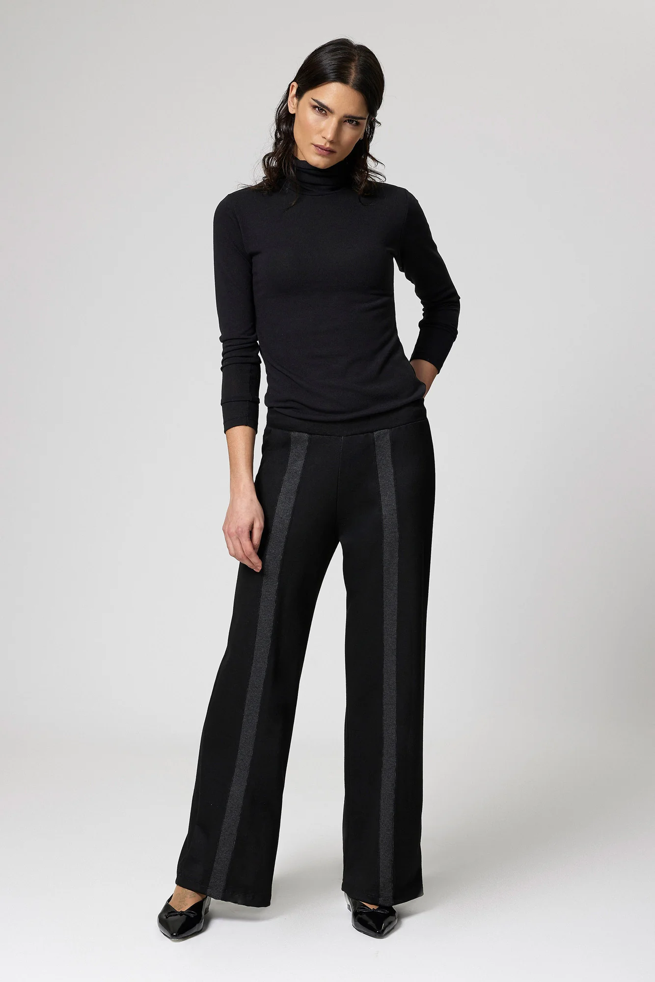 Pantalone dal design moderno e sofisticato, realizzato in tessuto jacquard bicolore, presenta una linea fluida e dritta che valorizza la silhouette con naturalezza. Le bande frontali a contrasto slanciano la figura e aggiungono un tocco di stile contemporaneo.