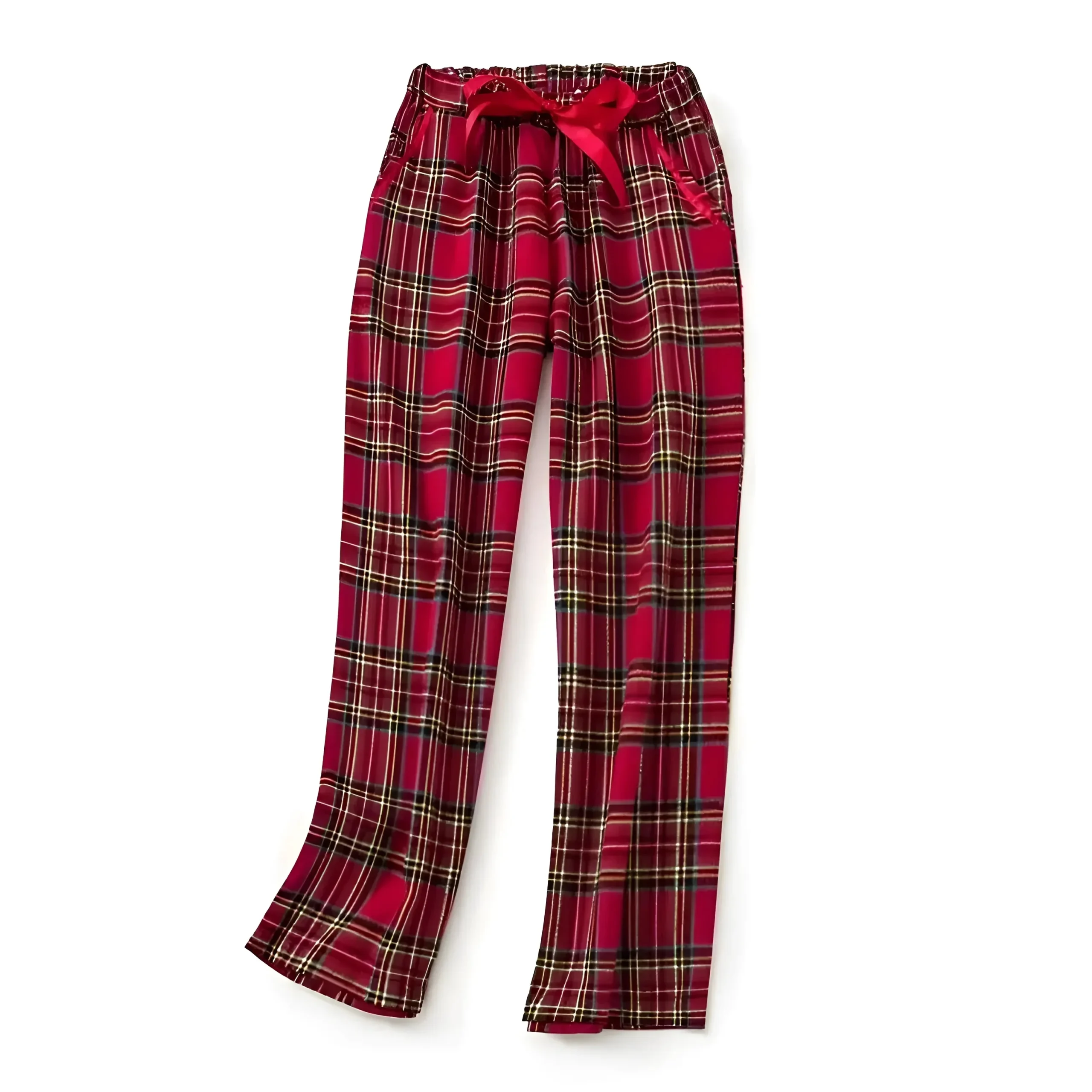 Abbraccia l’eleganza accogliente con i nostri splendidi pantaloni a lunghezza intera a quadri rossi, dotati di una deliziosa vita elastica e di un vivace fiocco. Infila le mani nelle tasche laterali e prova il comfort che rende ogni momento speciale—fai un regalo a te stessa oggi!