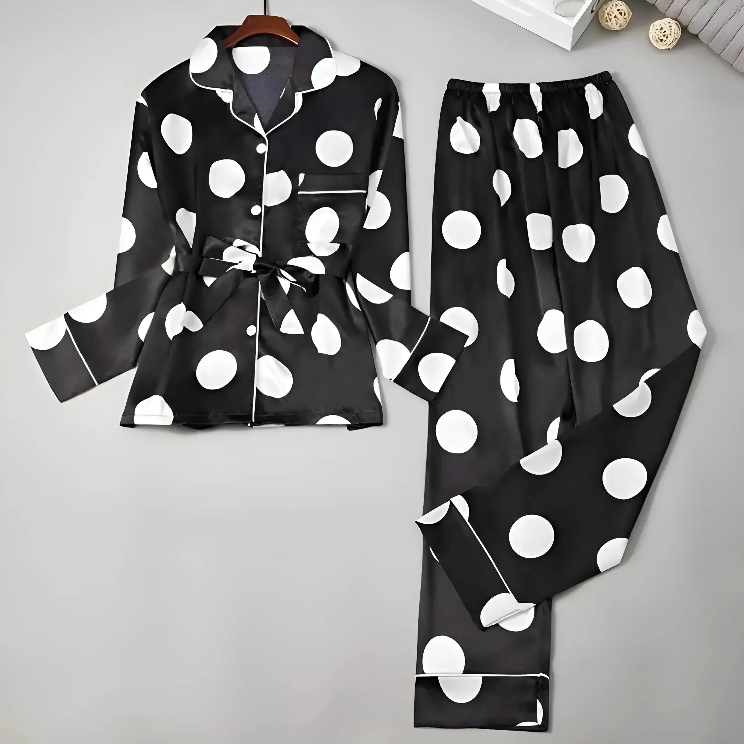 Abbraccia il tuo lato giocoso con il nostro elegante completo a pois neri, progettato per valorizzarti e darti potere. Indossa il comfort e lo stile oggi stesso: il tuo outfit perfetto ti aspetta!