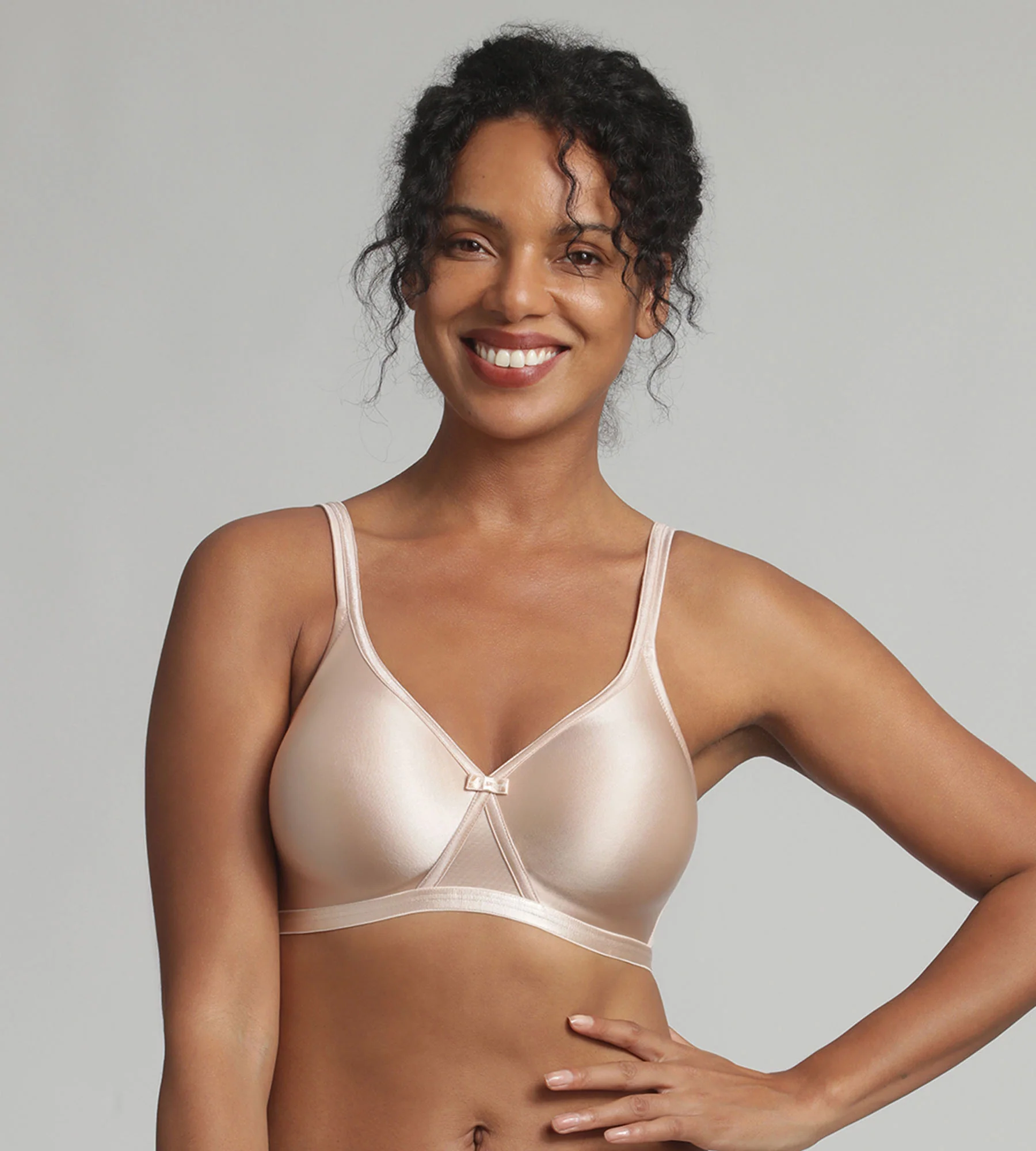 Questo reggiseno senza ferretto della linea Satiny Micro Support è impercettibile sotto qualsiasi indumento grazie alla sua microfibra lucida beige. La semplicità delle sue forme si combina con l’iconica costruzione di Playtex® per una massima discrezione. La schiena a forma di U, le spalline regolabili e le coppe avvolgenti senza ferretto offrono comfort e sostegno extra ideali per un uso quotidiano. Il fiocchetto di raso aggiunge un tocco femminile a questa biancheria intima.